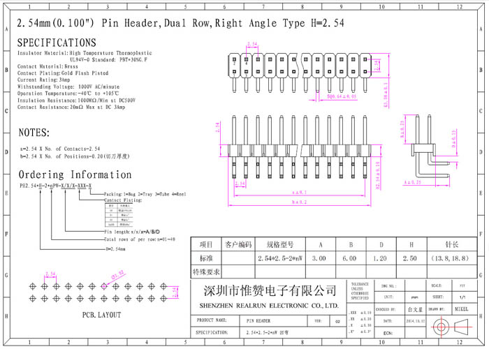 IATF 16949 Pass PA6T 2.54Mm Pin Header Connector Right Angle Type H2.5 Gold Plating